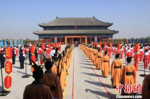 10月13日,来自海内外的百余位专家学者13日相聚山东苍山兰陵镇荀子庙,恭敬聆听祭祀荀子文,共同探讨荀子思想的当代价值。图为苍山兰陵荀子庙祭祀荀子。 杨晓卫 摄