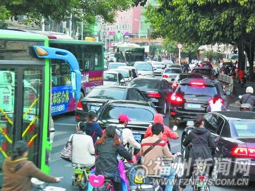 18日下午4时15分左右,记者来到福州市教院二附小所在的鼓楼区鳌峰坊,见路面两侧停满了接孩子的车辆,数量有六七十辆,因为中间空出了一个车道,因而鳌峰坊暂时处于有序通行状态。然而,15分钟之后,接到孩子的车辆开始陆续驶出鳌峰坊,途经两侧车辆仍静止不动的路段时,整个路面均被小车占领,从别处接送孩子放学回家的骑电动车的市民只能在小车的夹缝中通行。