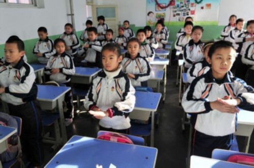 12月11日,河北石家庄光明路小学,全校的孩子都在教室练习一套“防霾”武术健身操。