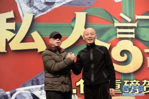 12月19日,在上海交通大学,《私人订制》导演冯小刚(左)与主演葛优在见面会上合影。 当日,由冯小刚导演,葛优、白百何、李小璐、郑恺领衔主演的2013年贺岁喜剧《私人订制》全国公映。冯小刚携主创团队亮相上海交大,并在观影后举行“答辩会”,给全场的学生观众订制了一场充满冯氏特色的公映见面会。 新华社发(赖鑫琳 摄)