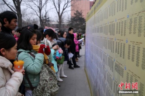 1月4日,2014年中国硕士研究生入学统一考试开考,中国传媒大学考点的考生在核对考场信息。中新社发 韩海丹 摄