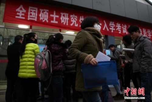 1月4日,在北京电影学院考点,一位戴着口罩等待入场考试的学生。当日,2014年中国硕士研究生入学统一考试开考。中新社发 熊然 摄
