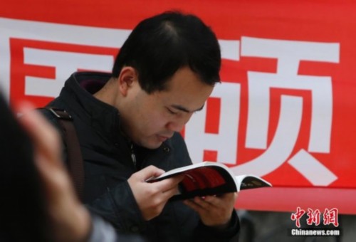 1月4日,2014年中国硕士研究生入学统一考试开考,中国人民大学考点的一位考生入场前看复习材料。中新社发 刘关关 摄