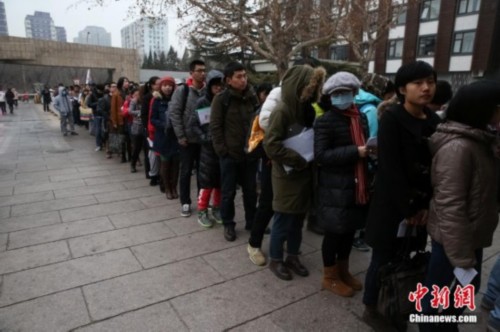 1月4日,在北京电影学院考点,等待入场考试的学生。当日,2014年中国硕士研究生入学统一考试开考。中新社发 熊然 摄