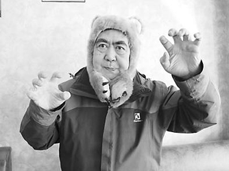 图:王迅戴着别致的帽子,摆出“熊出没”的动作。