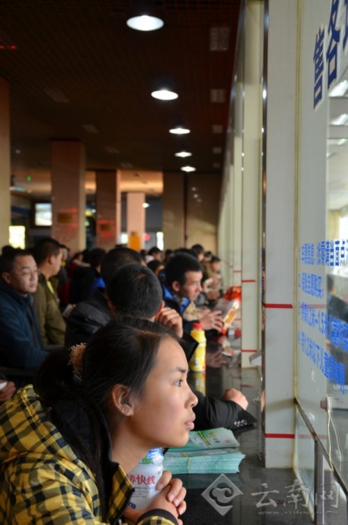 购票窗口外,乘客在焦急等待有无回家车票的信息