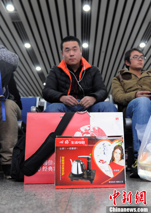 倚着候车室的座儿,带着耳机听着小曲儿,史先生悠闲的等待着列车检票时间的到来。才来北京工作半年的他,家乡在甘肃天水,“之前都在广东上班,但是离家实在太远了,就来北京了”,史先生说道,“这茶炉和一盒子家纺都是往家带的礼物,还有些网购的,已经邮回去了,另外,给父母的压岁钱肯定也不会少的。”图/张越 文/张龙云