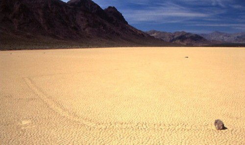 石头是怎么“航行”于死亡谷国家公园的赛马场盐湖,是一个从1915年人们就试图破解的奥秘。那年,一位探险家和他妻子注意到干旱的地面上有石头滚过的痕迹。没有宇宙的干预,要移动石头需要地面的力量。当前的主流理论于2011年由一队物理学家提出,他们是这样解释赛马场盐湖的“航行石”的:石头周围形成的冰使得石头移动,并且留下痕迹。但是,游客仍在期待一个更神秘的解释。