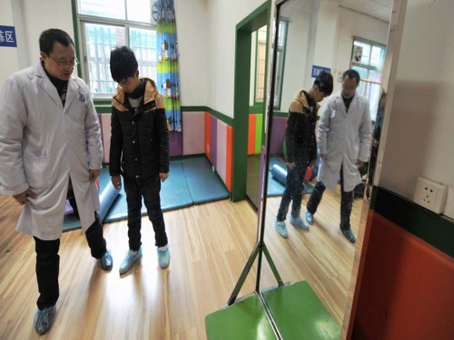1月12日,廖志胜在湖南省儿童医院康复中心接受康复锻炼。