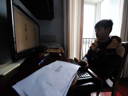 1月12日,廖志胜在自己卧室电脑前写剧本。