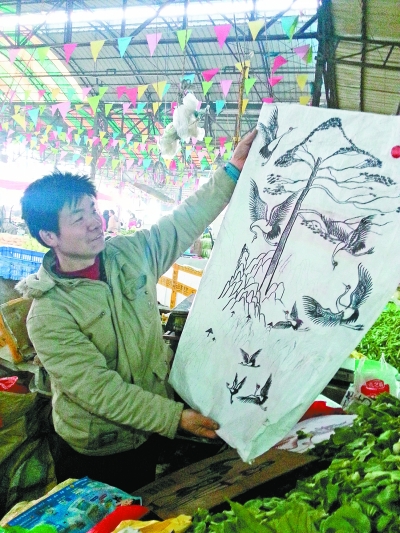 昨天,记者带着武汉纺织大学的姜老师来到武泰闸菜市场,找到正在蛇皮袋上作画的唐育明。姜老师仔细查看了唐育明的画作,并给出点评和指导,姜老师承诺以后会定期到菜市场指导唐育明。