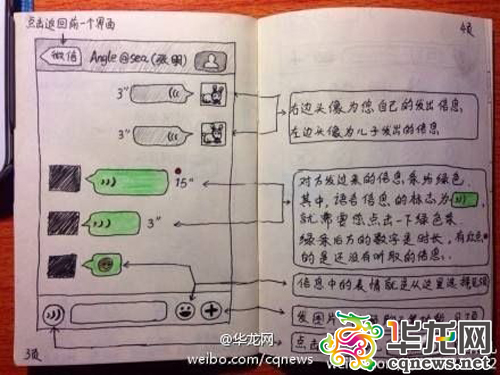 记者看到,张明的手绘教程,简洁但描述清晰,而且语言充满了对父母的爱。比如怎么发送语音信息,他的文字说明是:“出现‘按住说话'的时候,爸爸妈妈可以对准话筒,给儿子发语音信息啦,说完记得松手哦!”配上手绘,看上去十分“有爱”。