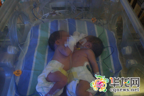 联体兄弟安静躺在保温箱里。新桥医院供图 华龙网发