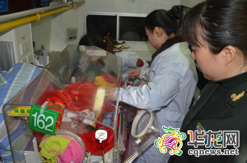 医院医护人员将联体儿从当地卫生院接上救护车保温箱。新桥医院供图 华龙网发