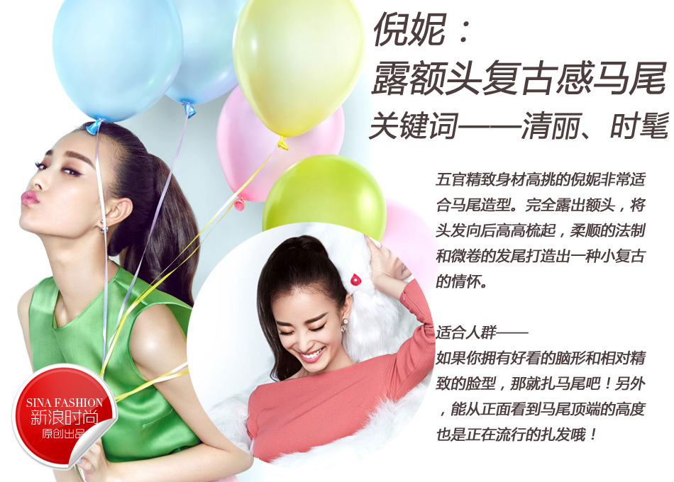 五官精致身材高挑的倪妮非常适合马尾造型。完全露出额头,将头发向后高高梳起,柔顺的法制和微卷的发尾打造出一种小复古的情怀。