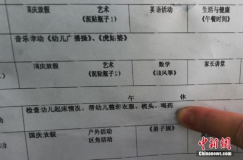 3月25日,数名学生家聚集在兰州市七里河区力天幼儿园,质疑该园在他们不知情的情况下,给孩子服用一种名为利巴韦林的药物剂,并引起不良反应。目前,当地药监局已对该园剩余8包利巴韦林冲剂进行封存检验调查,并由当地教育局派人对该园进行监管,协助公安、药检等部门对此事进行调查。图为该幼儿园一周活动计划安排表。中新社发 杨艳敏 摄