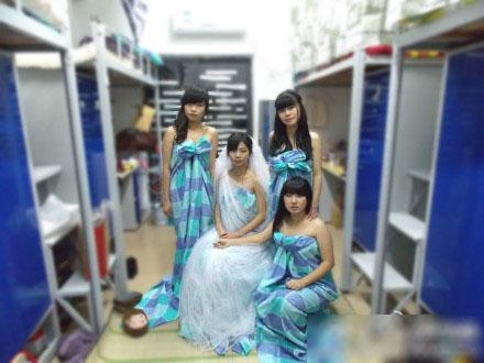 这几位女生还特意做了发型,这下更有写真的感觉了。其中一位女生小王(微博名“@__人生如此_拿酒来”)在微博上贴出了这组拍摄于宿舍内的写真,参加学校的摄影大赛,被网友争相点赞,“可以上T台走秀了,很美很有创意!”