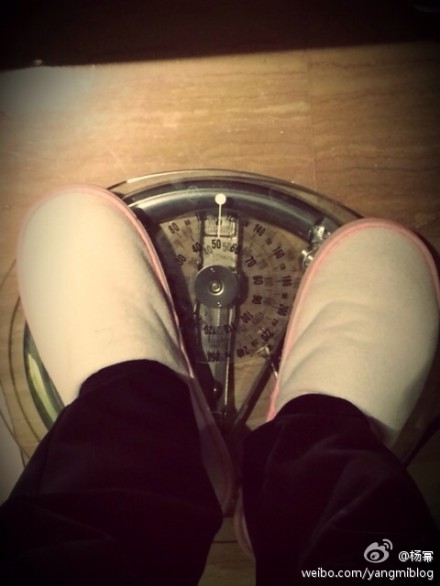 杨幂在微博晒出自己称体重的照片,并向女网友拉仇恨称:有生以来第一次过了50kg。