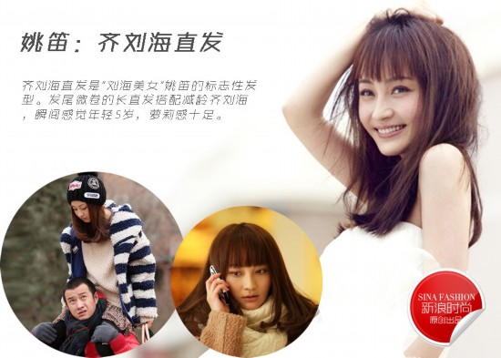 齐刘海直发是“刘海美女”姚笛的标志性发型。发尾微卷的长直发搭配减龄齐刘海,瞬间感觉年轻5岁,萝莉感十足。