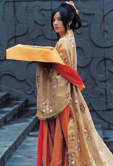 很碍视线,有点乱糟糟不经心的感觉,如果换个精致的发型相信效果更好,服装整体不错,典雅庄重,非常有层次感,色彩搭配非常得体,尤其是那一点橘红衬托出古典的美女的韵味,整个造型能够体现出古典的味道,高雅大方。