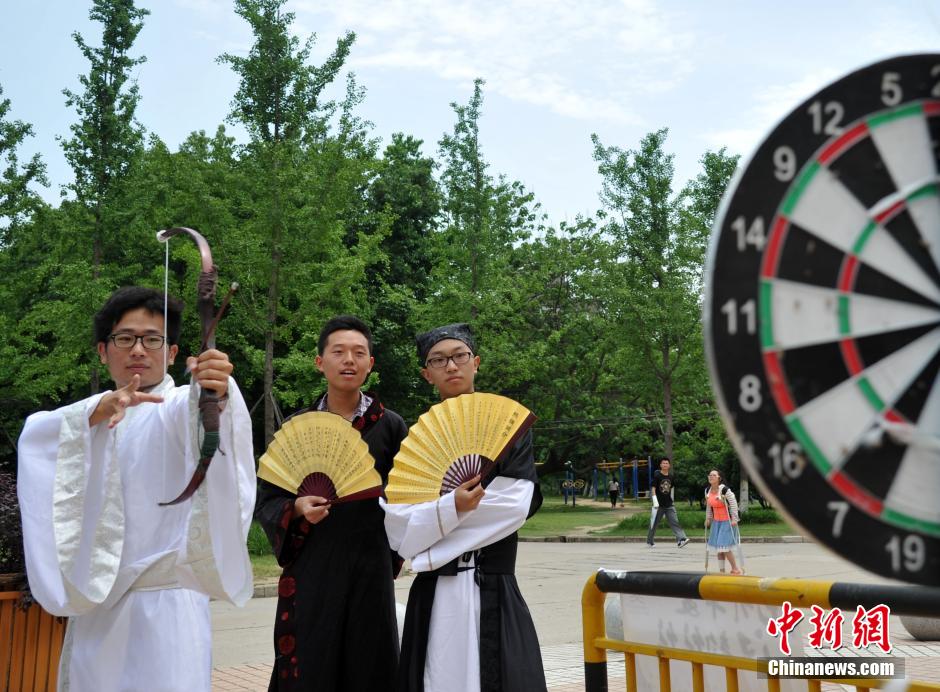 5月15日,中科大的学生们身着古装,上演真人“穿越”游戏。当日,位于合肥的中国科技大学举行“花开半夏,古装游园”活动。学生们穿上古装,参加“射箭”、“投壶”等游戏,古色古香又趣味无穷。中新社发 韩苏原 摄