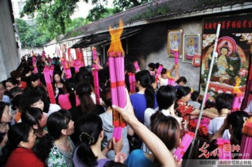 每逢每个月农历的初一和十五,“神树”下不足百米的巷子里,至少有数百名陪读家长同时烧香拜树。高考前一周,烧香拜树的家长更是摩肩接踵、“寸步难行”。5月29日,农历五月初一,这是2014年高考前的最后一个农历初一,加上毛坦厂中学今年取消“传统项目”送考节的新规,陪读的家长们更是赶趟似的在这里烧香,祈求自家的孩子得到这棵“神树”的“保佑”。围墙内,准备高考的学生们正在进行高考前的最后一次月考。围墙外,如潮水一般的家长拼命挤到神树下虔诚地烧上一把把的香。