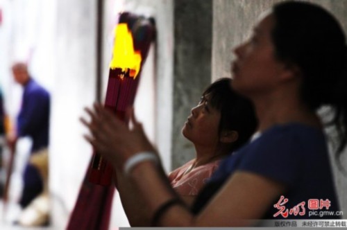 2014年5月29日,安徽六安毛坦厂镇,清晨6点多,仅一堵围墙之隔的校园里已经响起了读书声,墙外,越来越多的家长开始向"神树"下聚集,一名陪读母亲双手捧香,仰望着神树,满眼的无助与期盼。