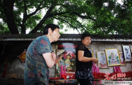 2014年5月28日,安徽六安毛坦厂镇,"神树"下,两名陪读的家长不动神色地走向卖香人的摊位,甚至不曾一瞥"神树"。
