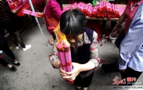 2014年5月29日,安徽六安毛坦厂镇,眼看着没有办法在"前线"烧香,一名老者点燃香后放弃了前行。她面对着"神树"对面的一堵民房的外墙烧香祈福。