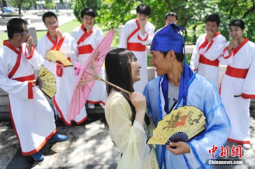 6月20日,太原理工大学,一对毕业生情侣扮成“才子佳人”拍毕业照,纪念校园爱情。临近高校毕业季,即将离校的中国大学生拍摄各种个性化毕业照,纪念在校园度过的青春岁月。中新社发 韦亮 摄