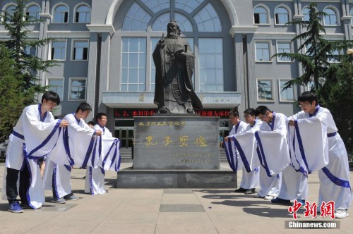 6月20日,太原理工大学,毕业生穿汉服古装拍摄“祭拜孔子”毕业照。临近高校毕业季,即将离校的中国大学生拍摄各种个性化毕业照,纪念在校园度过的青春岁月。中新社发 韦亮 摄