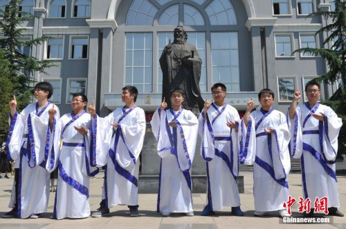 6月20日,太原理工大学毕业生身着汉服,模仿孔子造型拍摄毕业照。临近高校毕业季,即将离校的中国大学生拍摄各种个性化毕业照,纪念在校园度过的青春岁月。中新社发 韦亮 摄