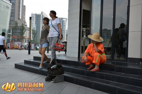 顾不上旁边逛来逛去的人,环卫工张明芳趁天稍微阴凉一点,坐在地铁站对面的台阶上休息,因为劳累,很快就睡着了