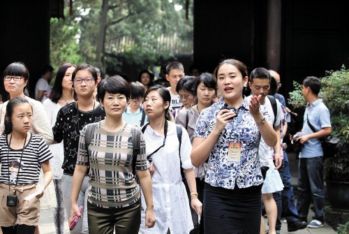 面对猛然增多的游客,武侯祠工作人员依然热情而耐心地讲解。