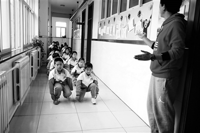 北京青年报记者昨日在朝师附小太阳星城校区看到,在课间操和体育课时间,低年级学生在教室外的走廊里进行鸭子步练习,高年级学生或在班级内学习手指操,或在走廊里学习弹腿跳、正踢腿。