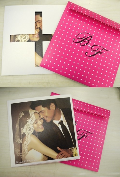 范玮琪、陈建州的婚礼请柬范玮琪和陈建州的婚礼喜帖是一张近33公分见方的“巨帖”,这尺寸令不少朋友大吃一惊。喜帖是桃红色,外面有两人的英文名字“B”“F”的缩写,中间是十字架设计,除代表双方信仰外,还是“1 1等于家”的“加( )号”,寓意相当美好、巧妙。