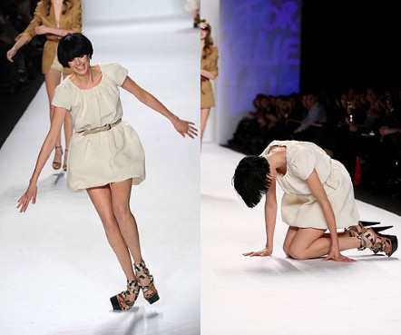 对于模特来说,在T台走秀时受到了万千关注,这个时候肯定不希望自己摔倒。但是历年T台上摔跤事故频频,让不少大牌模特吃尽苦头。驾驭着10厘米的超高跟美鞋,穿着华丽衣裙,在聚光灯和万千摄影机之下,模特们需要有多大的勇气才能使自己信心十足,不出差错呢?毕竟,对于大多数模特来说,T台上不能滑倒是绝对的真理。