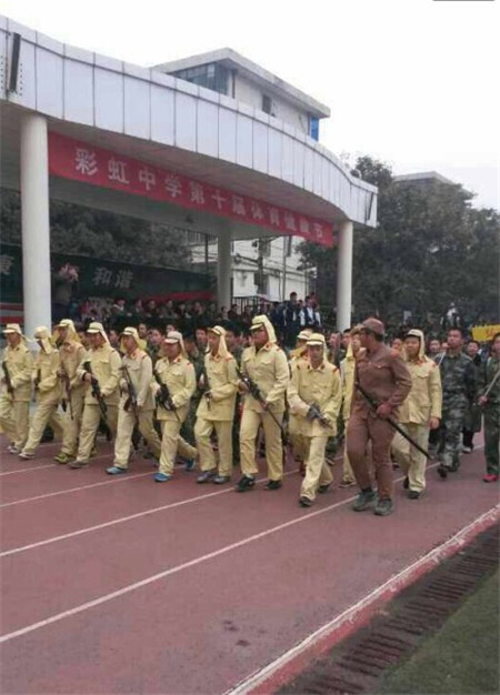 今日,记者从咸阳市彩虹中学得到“彩虹学校关于体育健康节开幕式有关情况的说明”,说明指出:10月29日下午3:00,彩虹中学举行第十届体育健康节开幕式。今年的开幕式,高一年级的研究性学习小组结合当前形势,将爱国主义集中展现,主题是:“勿忘国耻,振兴中华”。学生们自编自演通过短剧表演和场外解说,展示了抗战时期的英雄人物“狼牙山五壮士”、“李云龙”等与日寇浴血奋战的故事,按节目需要租赁了一些服装道具,开幕式上有各年级运动员方队、表演方队出场的场景。事后网上转载了学生们身着日本军服出场的照片,引发了网友的关注。