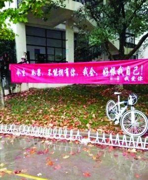 黄泽花费了1000多元,制作了两条大横幅和900张小条幅,还买了一束玫瑰花。昨天零点左右,尽管外面下着小雨,黄泽找了10名小伙伴帮忙,将条幅挂在树枝、车棚顶等地方,大约到2:40才布置完毕。早晨5点多,黄泽又和3名小伙伴将横幅挂到了教学楼下,并在教学楼内布置了不少条幅。