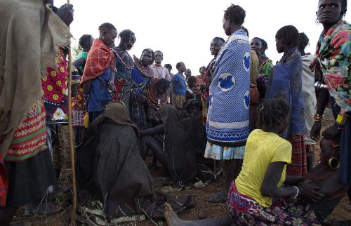 波科特女孩们裸身披着兽皮,蹲坐在石头上,仪式之前,她们还必须清洗身体。