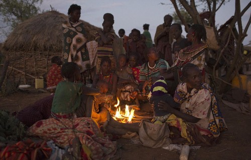天未亮,波科特妇女及儿童围在火堆旁,等待着割礼的开始。