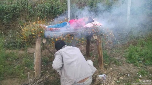 2014年11月25日,云南文山。躺在草药床上的女儿被草药烟熏得有点儿呛,连忙用小手捂住鼻子。