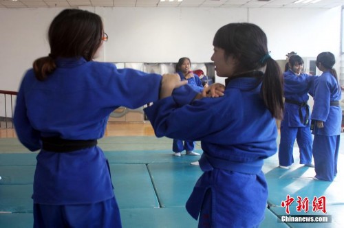 图为女学生在课堂上进行实战擒拿演练。马义恒摄