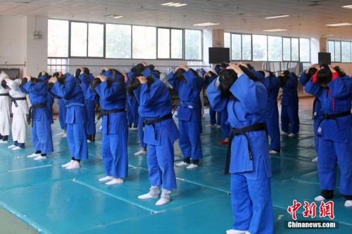 图为实战防身演练过后,女学生在教师带领下做放松运动。