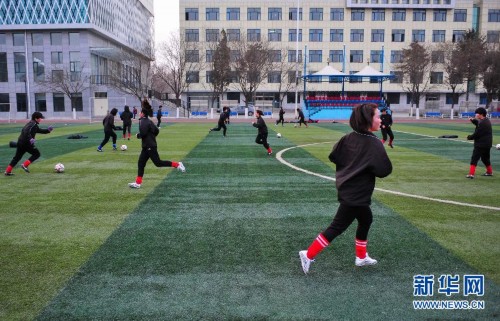 初冬时节,天气渐冷,呼和浩特市蒙古族学校的女足队员们依然坚持在户外训练。40多名小球员年龄大多在15岁左右,她们奔跑跳跃着,使得冬日的绿茵场上生机勃勃。