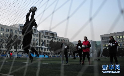 图为11月27日,呼和浩特市蒙校女足的守门员在训练中。新华社发(连振摄)