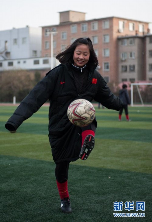 图为11月26日,一名呼和浩特市蒙校女足的小球员在练习颠球。 新华社发(连振摄)