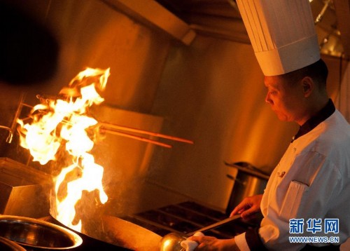 11月26日,汪家驹在酒店后厨烹饪。一个人,一张嘴,一把勺——25年前,香港人汪家驹离开家乡来到内地开始追寻他的美食梦想。对汪家驹来说,美食不仅在舌尖上,更在脚下。他先后在北京、山西、四川、福建掌勺,在全国各地无数食客的舌尖上留下了他的“味道”。“中国内地的饮食文化博大精深,这正是吸引我的原因。在这里打造美食就和神农氏尝百草一样,得去不同的地方发现、尝试、搭配。”汪家驹说。如今,汪家驹是宁夏银川一家酒店中餐厅(清真)的行政总厨,他结合粤菜烹饪技巧,通过不断的研究和尝试,打造出了适合西北人口味的“清真粤菜”,广受国内外穆斯林顾客的欢迎。 2014年APEC期间,擅长清真中餐烹饪的汪家驹经过遴选成为了掌勺峰会期间宴会的大厨之一。汪家驹说,“为国家烹饪是我的荣耀,让更多的人品尝到美食是我的梦想。” 新华社记者 陈君清 摄