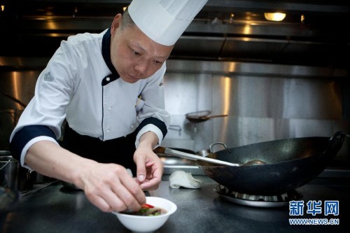 11月26日,汪家驹在酒店后厨烹饪。一个人,一张嘴,一把勺——25年前,香港人汪家驹离开家乡来到内地开始追寻他的美食梦想。对汪家驹来说,美食不仅在舌尖上,更在脚下。他先后在北京、山西、四川、福建掌勺,在全国各地无数食客的舌尖上留下了他的“味道”。“中国内地的饮食文化博大精深,这正是吸引我的原因。在这里打造美食就和神农氏尝百草一样,得去不同的地方发现、尝试、搭配。”汪家驹说。如今,汪家驹是宁夏银川一家酒店中餐厅(清真)的行政总厨,他结合粤菜烹饪技巧,通过不断的研究和尝试,打造出了适合西北人口味的“清真粤菜”,广受国内外穆斯林顾客的欢迎。 2014年APEC期间,擅长清真中餐烹饪的汪家驹经过遴选成为了掌勺峰会期间宴会的大厨之一。汪家驹说,“为国家烹饪是我的荣耀,让更多的人品尝到美食是我的梦想。” 新华社记者 陈君清 摄