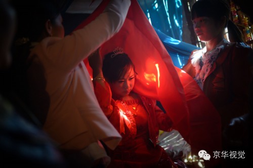 迎娶前,闺房中的秀秀,即将盖上红头纱。